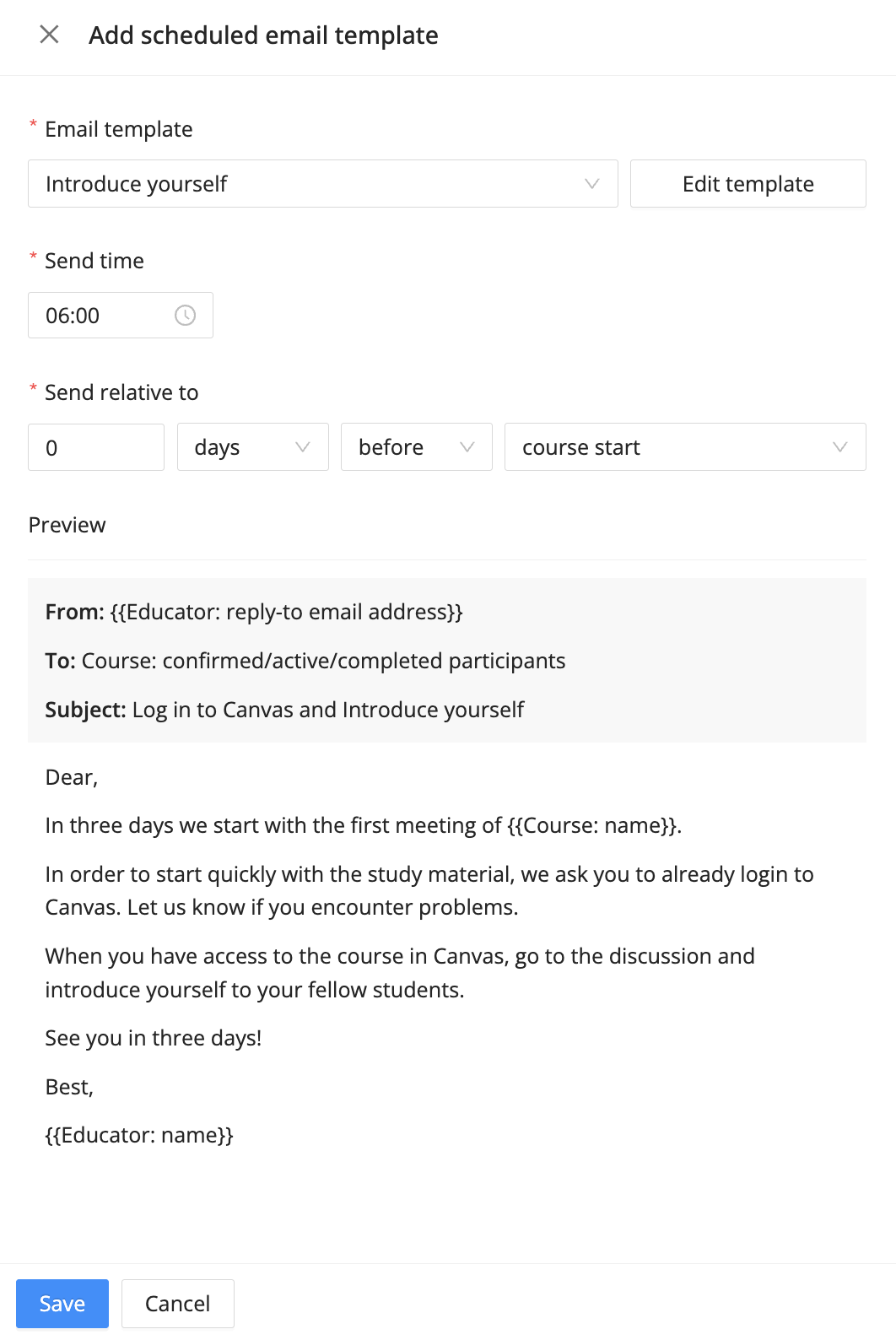 Email Template: If you already created the Email Template in the settings, you can select the Email template here. Otherwise you have to go to settings to create your email template. See this article for information on how to create email templates for courses.