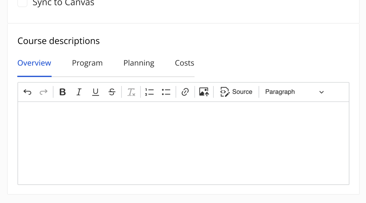 Edition description sections are displayed on Course and Program editions. Each tab can contain formatted content, such as text or images, that is used for integrations — for example, to display information on your website.