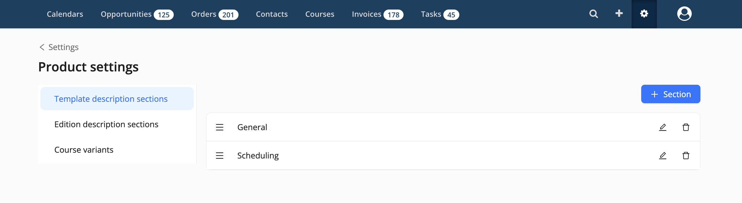 The Products Settings section consists of three parts: Template Description Sections, Edition Description Sections, and Course Variants.