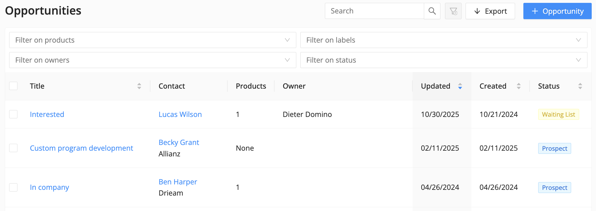 - You can add one or more product templates/editions to one opportunity. - You can filter on: Products, Owners, Labels and Status.