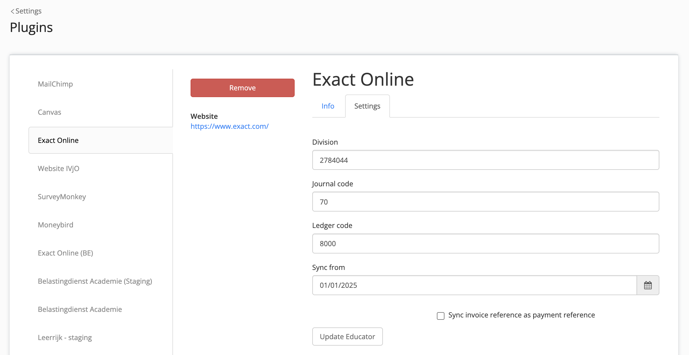 Important note: The Exact Online plugin only synchronises invoices on creation or update of an invoice. If a wrong division/ledger code/journal code is chosen, the invoice needs to be manually resaved in Eduframe to synchronise it.