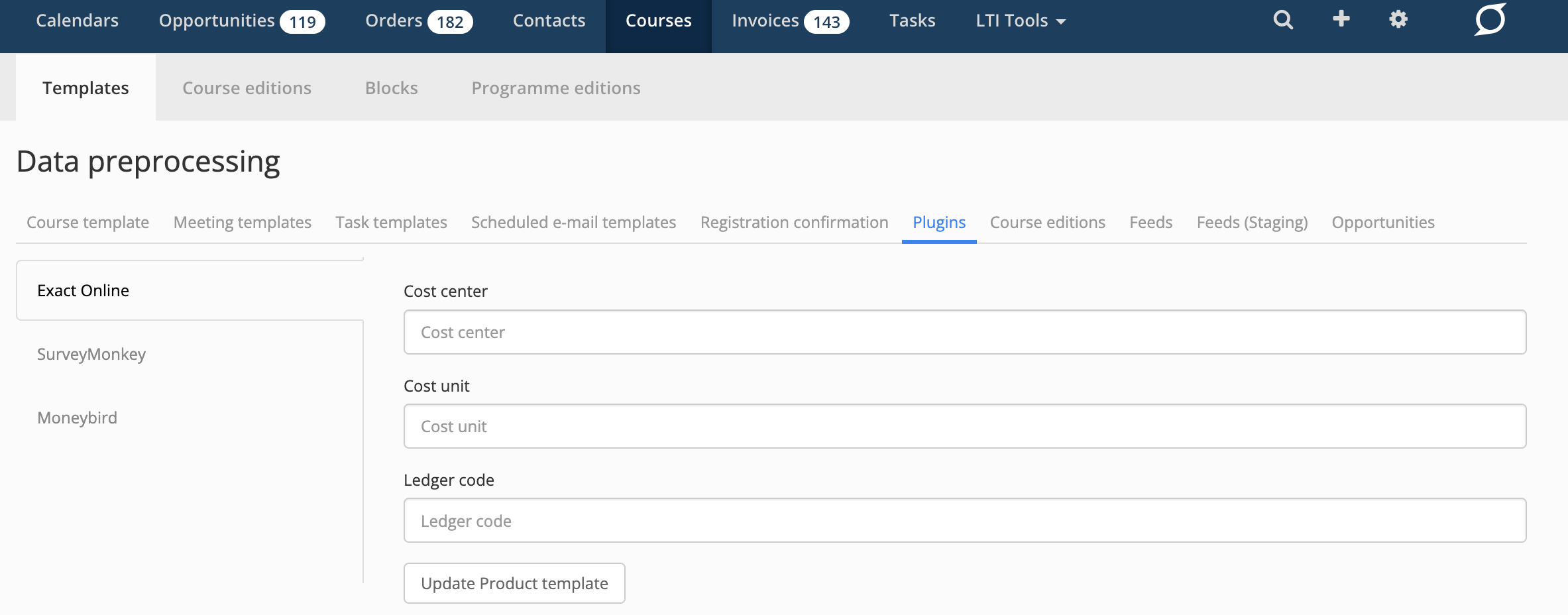 It is possible to choose the ledger account, cost center and cost unit that invoices for one course should use. When an invoice is created based on the relevant course template, the entry is directly linked to the chosen cost unit and cost center in Exact Online.