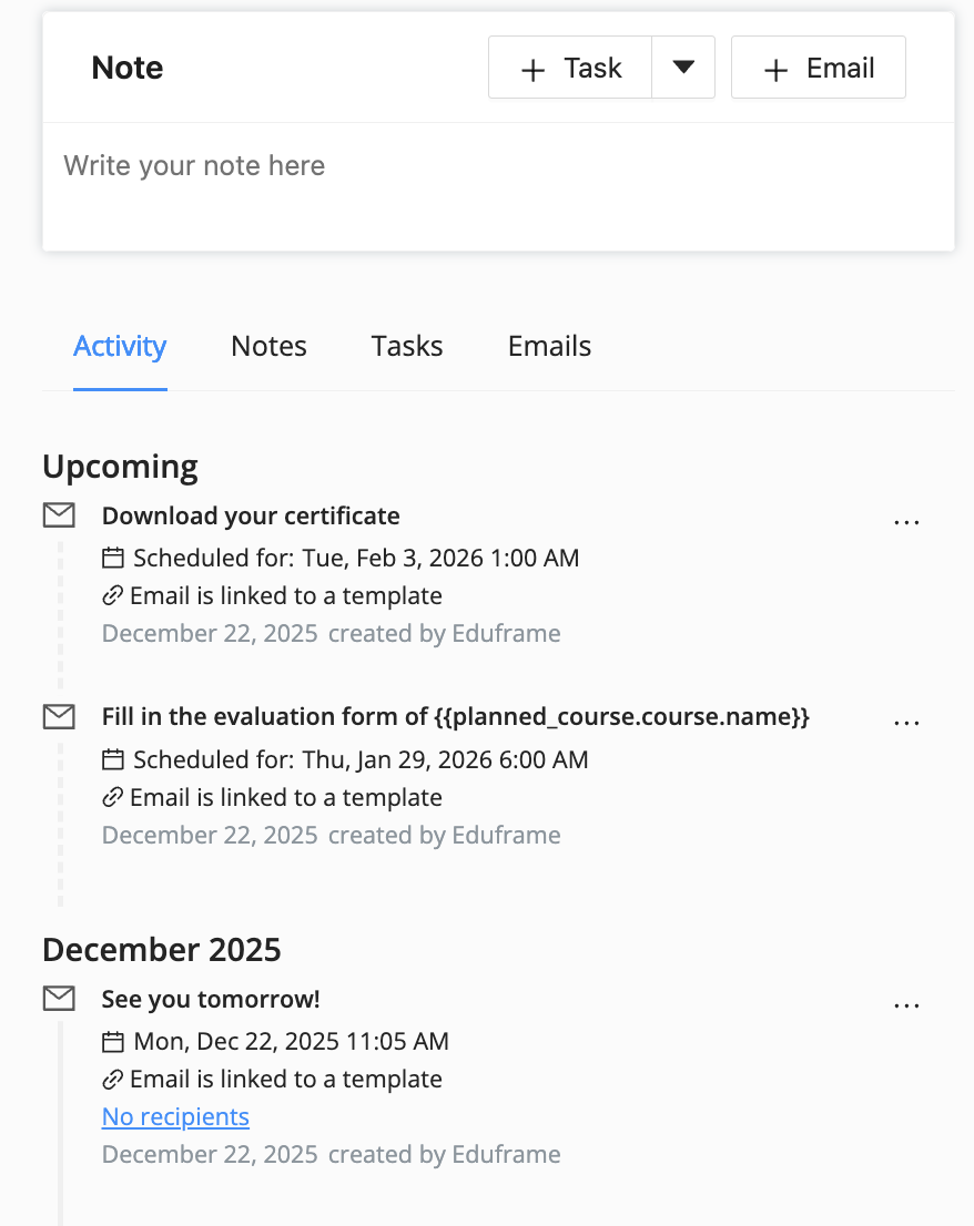On the right side of each course edition there is the possibility to create notes, tasks or emails for this specific course edition.