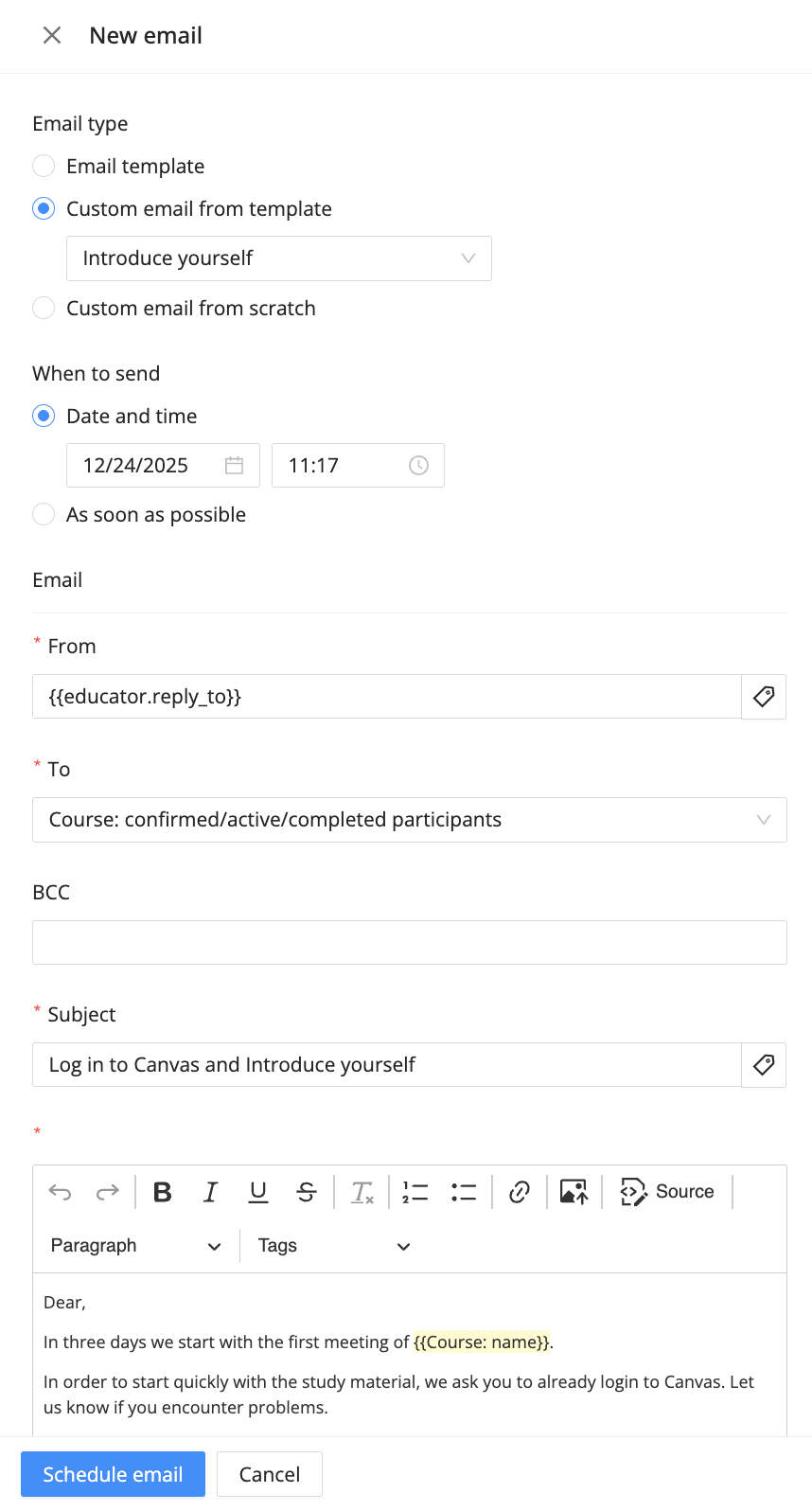 - Custom email from template: Choose this option if you want to start from an already existing email template but want to make some changes before scheduling the email