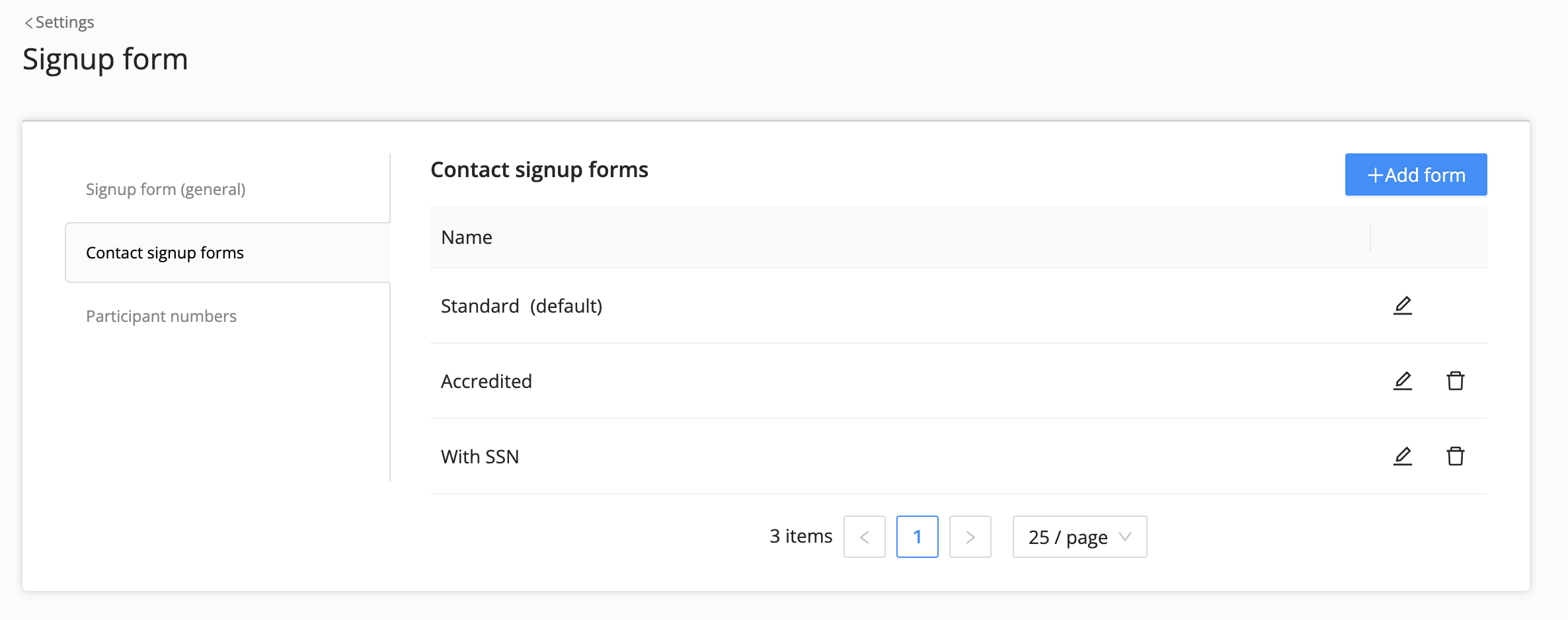- After you created one or more custom contact fields, you navigate to Settings > Forms > tab 'Contact signup forms'. Here you can edit the default contact signup form or create a new contact signup form. The default form is by default used in product templates, but can be replaced with another signup form.