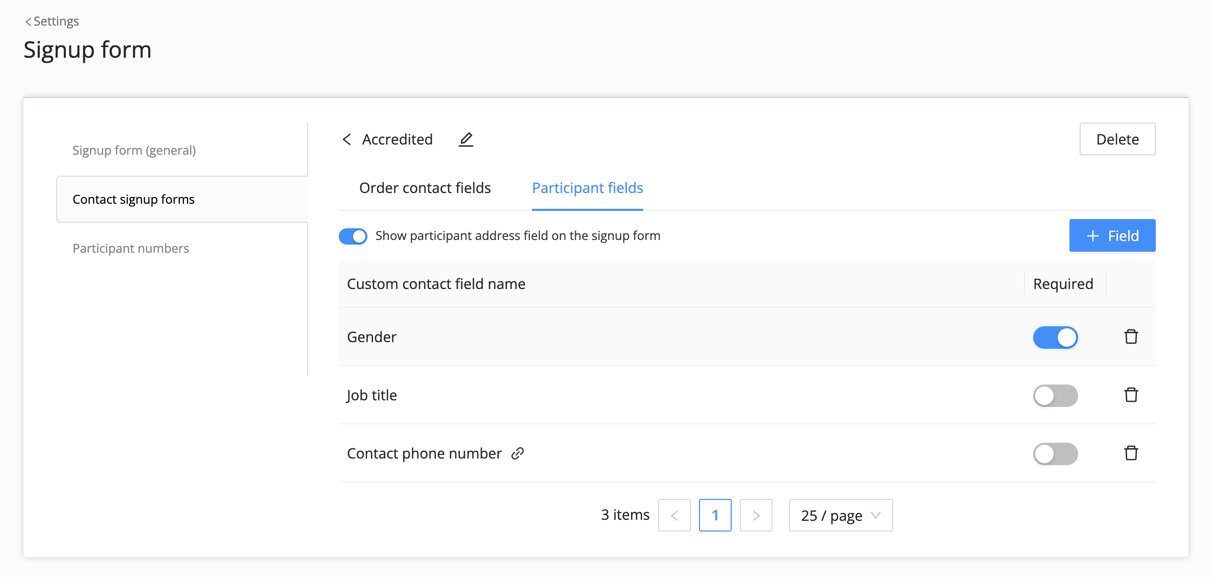 - After adding a new contact signup form or by editing an existing signup form, you can select one or multiple custom contact fields to the form with the blue '+ Field' button. This can be done for both the participant or order contact with two tabs on top of the page: