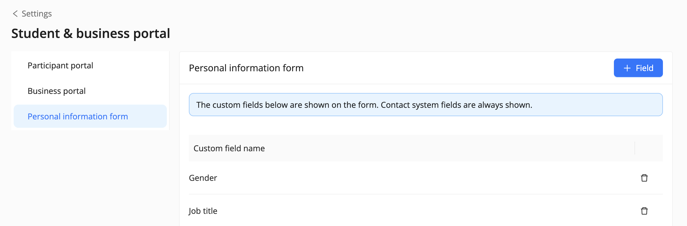 Note: The default system contact fields - name and email - are always visible on the signup form and in the different Eduframe portals. This is not the case for address. However, with the setting 'Show participant address field on signup form', you can hide or show this (optional) contact system field as well. Note: To decide which custom contact fields are visible in the student portal or business portal, you go to Student & Business portal settings. Adding those custom fields to a signup form does not automatically make them visible in these two portals.![]()