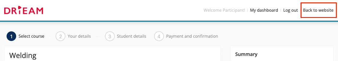 - Pass the URL you want to use for the 'back to website' button in a query parameter when opening the Eduframe registration form. This needs to be implemented on your own website. The query parameter should be structured as follows: '?back_to_website_url={desired URL}'