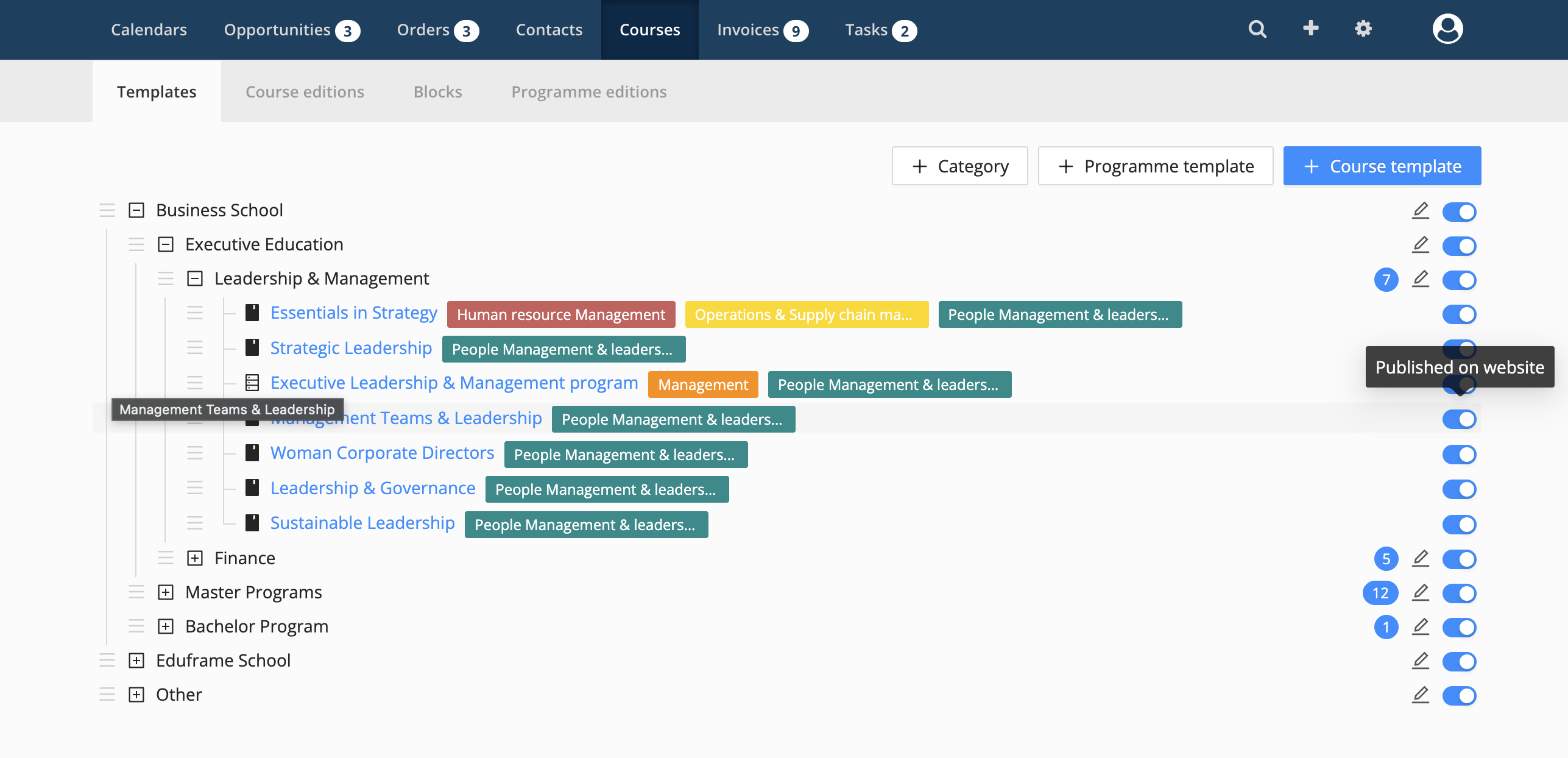 In Eduframe there is a hierarchy between categories, templates (program and course templates) and editions (program and course editions). Each edition belongs to a template, and each template belongs to a category. All categories, templates and editions, which from now on we will refer to as entities, are able to be published and be visible on the website & signup form.