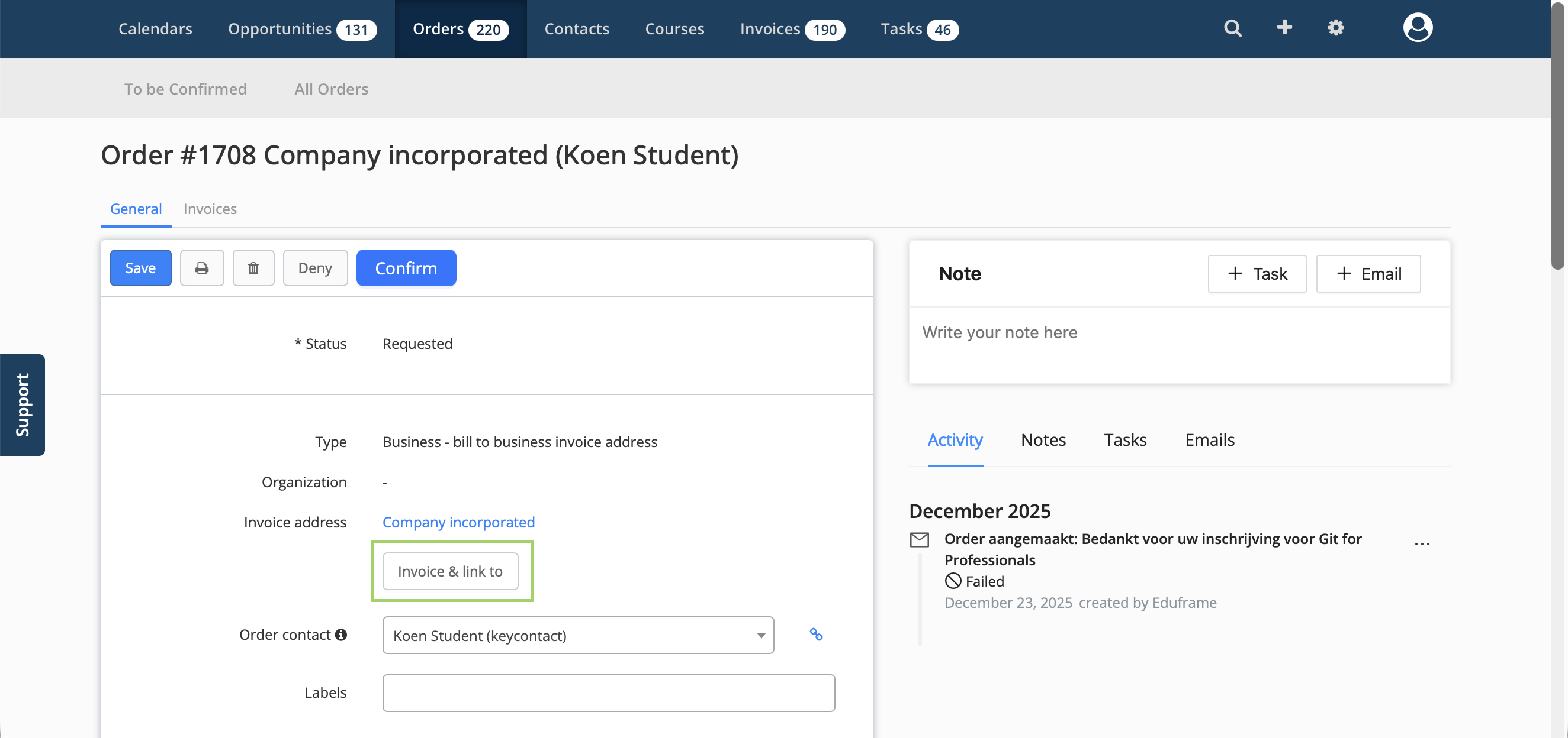 Did the participant make a mistake or change their mind? No problem - you can update all of the details above on the order detail page.Grouping business orders using Eduframe's 'Organizations'
