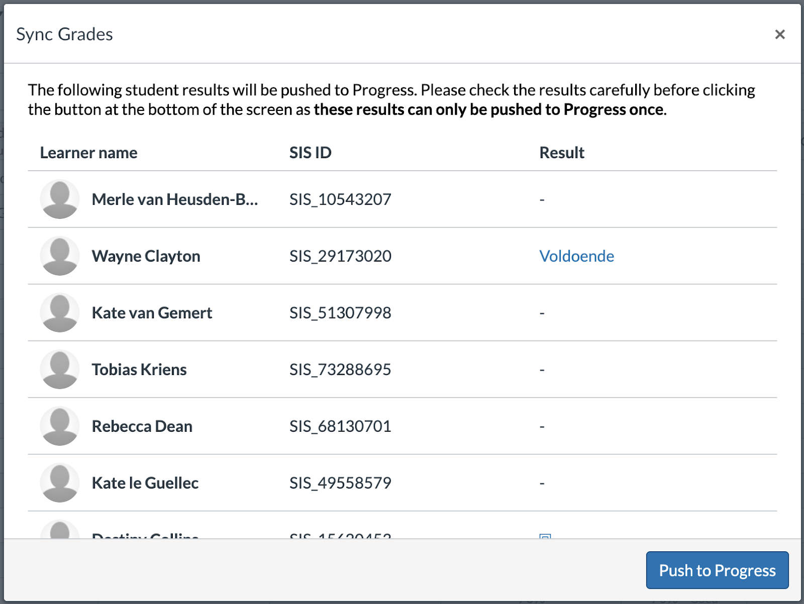 Nadat je de juiste opdracht (of “Gebruik eindcijfer”) hebt geselecteerd krijg je een overzicht te zien van de verschillende studenten (Naam, SIS ID en Resultaat). Als alles klopt kan je nu op “Sync grades” klikken om de resultaten automatisch te verwerken in het SIS.