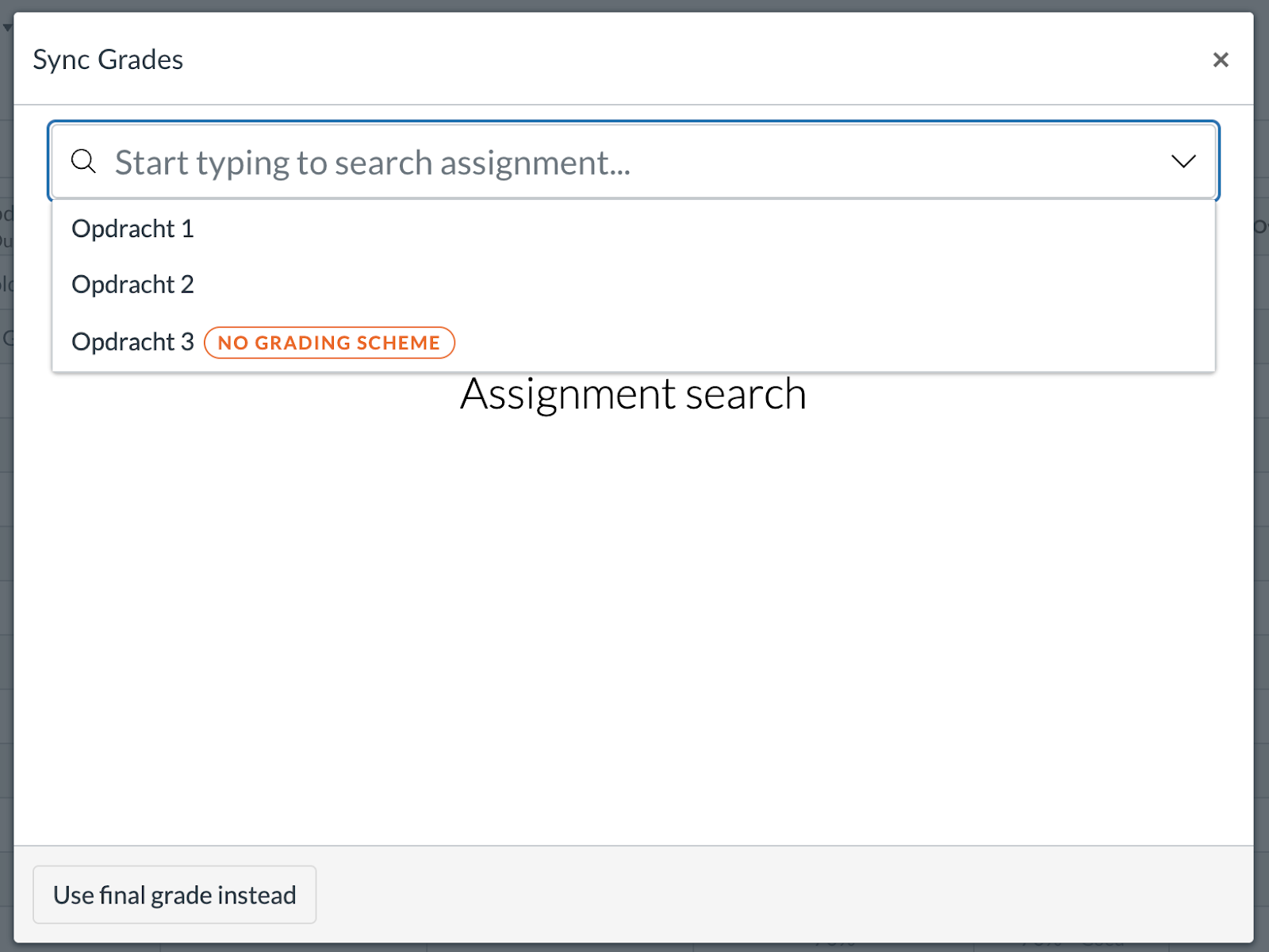 Tevens is het mogelijk om linksonder te klikken op: “Gebruik eindcijfer” (ENG: “Use final grade instead”), hiermee is het mogelijk dat je het eindcijfer van een vak doorstuurt naar het SIS. In dit geval wordt het beoordelingsschema dat correspondeert met het vak automatisch geselecteerd en gecheckt.